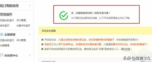 4.如果身份证支付宝验证都没有问题点击下一步同意须知就可以进入到常用操作页面之中,包括“已卖的宝贝”,评价管理,发布宝贝,出售中的宝贝等项,并有提示亲,店铺创建成功了。