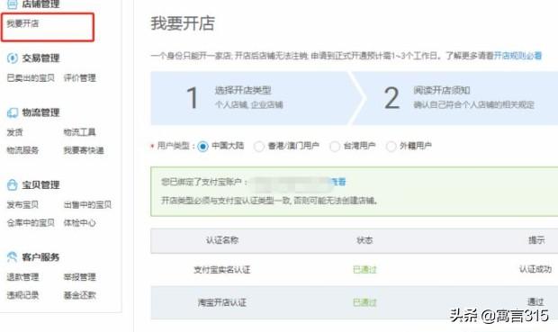 3.点击店铺管理下的“我要开店”,并按要求逐一的添写,需要身份证验证,支付宝绑定。