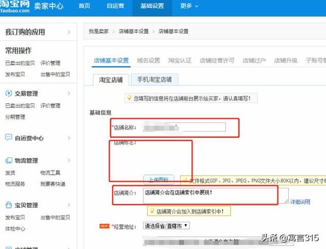 5.可以在基础设置中设置自己淘宝店铺的名称,或者手机淘宝的店铺名称,店铺logo,主要货源,店铺简介装饰淘宝店铺的选项。