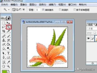5、在“框架”图层之上再新建一图层,名称为“主体元素”。打开一张事先准备好的百合花图片,双击“背景”图层将其转换为“图层0”,点击“魔术棒”工具,在图片白色区域内点击,选择白色区域后,按下DEL键删除白色区域。