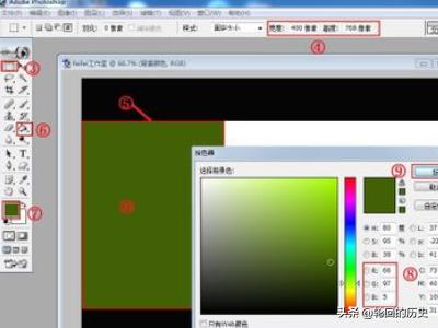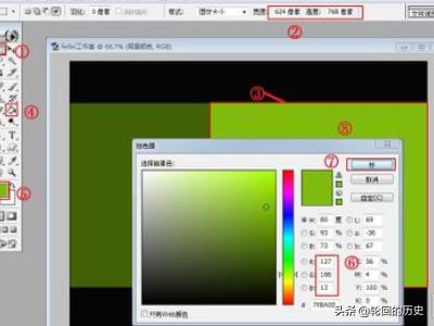 4、然后在窗口的左侧框选一部分内容,填充一种深绿色。然后点击“矩形选择工具”,设置“宽度为624,高度为768,然后在窗口的右侧框选一部分内容,填充一种浅绿色。填充两种颜色饱和度有一点差别的颜色,目地是产生较为明显的对比。