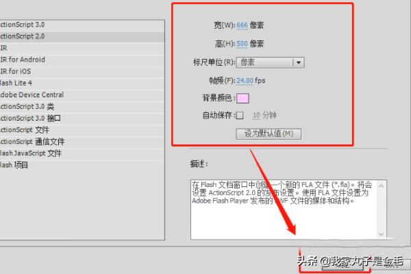 2、弹出“新建文档”的对话窗口,在这个新建文档窗口中设置flash文档的大小等属性然后进行创建。