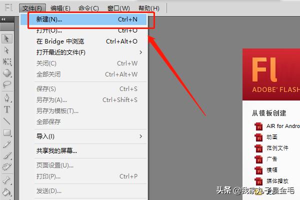 1、双击flash的软件快捷图标启动打开这个软件,然后执行文件菜单栏中新建命令。