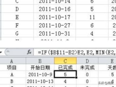 2、在数据区域原C列左侧插入两列,分别表示以B11单元格中日期为当前进度的各项目已完成和未完成的天数。如图所示,插入两空列后,在C2单元格中输入公式:=IF($B$11-B2>E2,E2,MIN(E2,MAX($B$11-B2,0)。