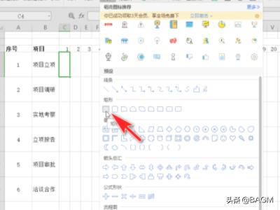 5、我们从第一项目开始日期选中该单元格,插入-形状-矩形,绘制一个长方形,从起始到截止日期。