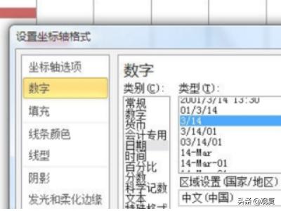6、再次单击图表中的“水平(值)轴”,在“坐标轴选项”中将“最大值”和“最小值”设置为“固定”,并输入整个工程的开始日期和结束日期,本例中将最小值设置为日期“2011-10-9”,将最大值设置为“2011-11-10”。如果是Excel 2007,此处需输入上述两个日期的序列数,分别为“40825”和“40857”。获取日期序列数的方法有许多,如将包含日期的单元格设置为“常规”即可在单元格中显示该日期的序列数。