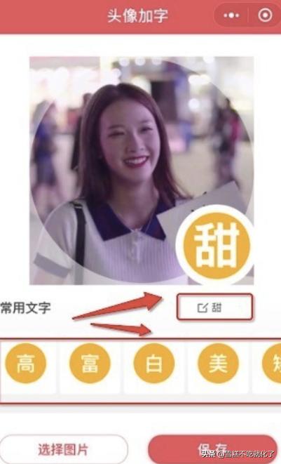 5、再或者我们选这个「头像加字」,进来可以看到头像右下角加了一个字,底部有很多模板,白、富、美、高、帅、坑等等,也可以自定义输入你的名字,制作带姓氏的头像,同样保存下来,做微信头像就可以了;